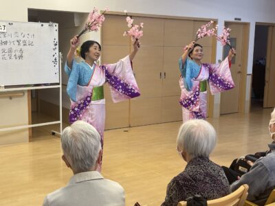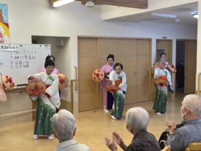 ケアタウン福野 お知らせ / 2024-05-31 5月30日 ケアタウン福野に、「横町民謡クラブ」の皆さんが慰問に来てくださいました。 素敵な衣装としなやかな舞に、利用者の方々も職員終始ウットリ💛💛 次回の慰問も楽しみにお待ちしておりますヾ(*´∀`*)ノ
